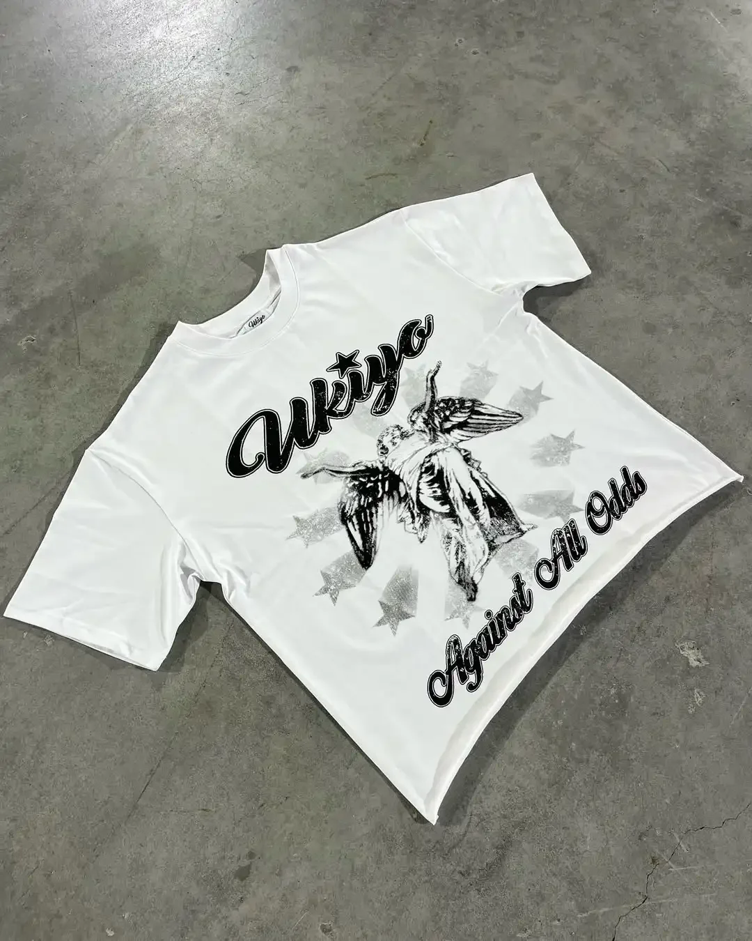 This T-shirt features a bold newspaper-style graphic inspired by vintage and street art aesthetics.